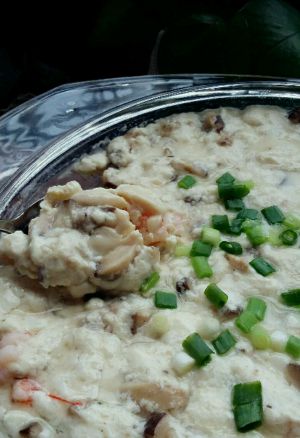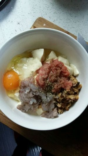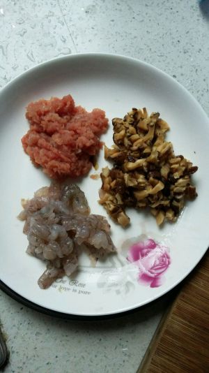 新鲜虾仁去壳切丁、牛肉剁成沫、香菇泡发后切成小丁