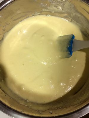 把三分之一蛋白加入蛋黄面粉糊中,用刮刀上下翻拌均匀,再把拌好的面糊倒入蛋白盆里,同样方法上下翻拌均匀。