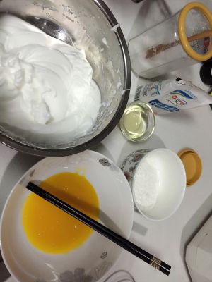 蛋白和蛋黄分开放置,打发蛋白,打的时候要先后分3次加入白糖,边打边加,耐心打至干性发泡。