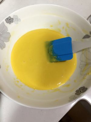 往蛋黄液里加入白糖,色拉油和牛奶,搅拌均匀,再加入过筛的面粉,用刮刀上下翻拌至无颗粒状。