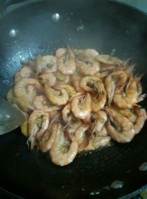 接着倒入明虾继续大火翻炒