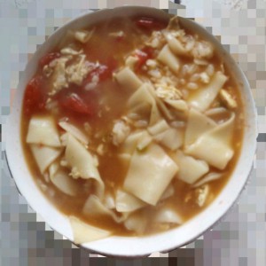 锅里加油烧热倒入西红柿翻炒,再倒入鸡蛋,放姜粉,盐,花椒翻炒加水。烧开后下面条,面条煮熟后放鸡精和老抽,洒入葱末出锅(我们这边比较喜欢吃一锅煮的面片,不喜欢的人可以面条另外煮~)