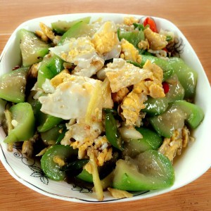 锅放少量油,热油后加姜、蒜、青椒,然后加丝瓜。最后放入煎好的蛋。起锅前加盐、味精、胡椒粉。