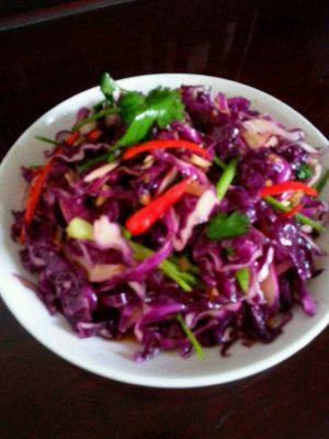 紫甘蓝用手撕开一块块的,清水洗过2遍后用淡盐水浸泡20分钟,20分钟后重新用清水过一遍,然后控干水切成长条丝,香菜和辣椒也切长条(丝)