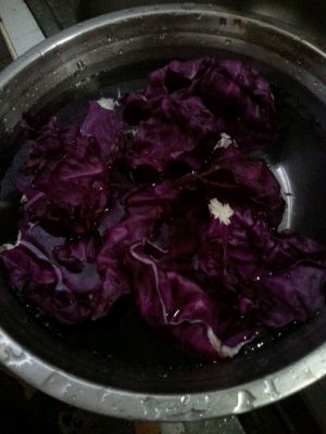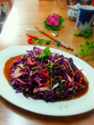 紫甘蓝还可以拌醋吃,酒楼里用做沙拉菜,但我个人更喜欢用蒜末生抽香油拌着吃,大家不访试试拌上一盘吃,我觉得好好吃哦!