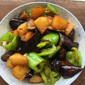 葱姜蒜辣椒大火爆香,下土豆茄子翻炒两下以后加入青椒继续翻炒,放入盐,酱油,翻炒均匀加一点水,不然会太干。出锅前加一点点鸡精提鲜。好啦,大功告成。