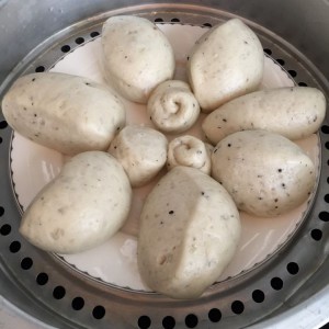 拿出面团排气,面团变小,放了点芝麻下去揉,揉好形状摆好,静置半个钟会第二次发酵变大(温度越高越快发大)