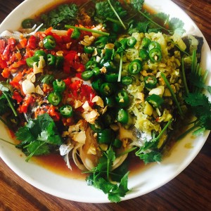 切好的朝天椒铺在已经蒸好的鱼头上,可以根据个人口味放香菜等其他配料,