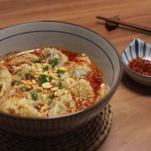 把煮好的抄手捞出来倒进碗里,可以少少的加一点汤,撒上花生碎和香葱,开吃~