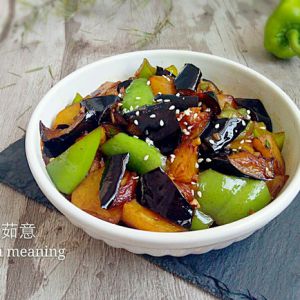炸好的茄子与土豆倒入锅中。+1丢丢盐。