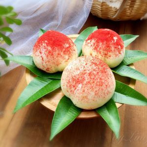 造型好的桃子放入冷水蒸锅中醒发约10分钟。接着用中火蒸约12分钟,关火5分钟后再掀盖