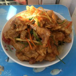 第一次,是为了定型,可以用手把肉充分粘上浆然后展开来放到锅里,不用管,肉熟了基本上会飘起来,可以用筷子戳一戳,如果一戳就起来说明也差不多,然后让他们在炸一下,感觉微微有点变黄或者焦的意思,就可以捞出来了。
