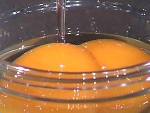 把罐头打开,取出里面的半个黄桃和15毫升的桃汁。