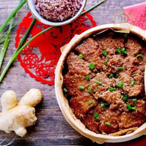 食材:芋头、五花肉、小葱末、姜片、生抽、糖、料酒、豆腐乳、盐、蒸肉粉、全部提前备齐