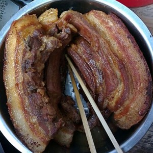 淋好酱油的五花肉放入锅中,盖上锅盖以防烫到手,直到五花肉炸到金黄色,猪皮脆了就可以拿出来了。