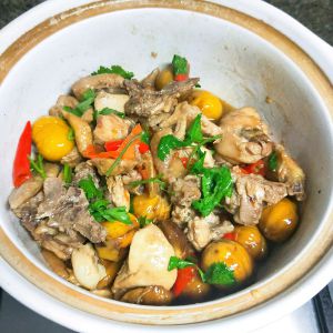 倒入适量的开水,没过鸡块就行,大火烧开后倒入瓦煲继续小火炖煮。