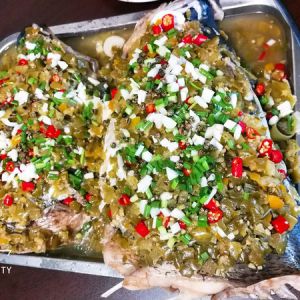 最后在鱼头上撒上小香葱 蒜末 麻椒 热锅烧油 油热后浇在鱼头上就,可以吃了