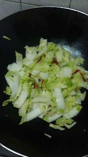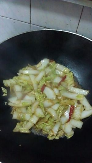 白菜炒至半软,加入已调匀的调料调,继续翻炒