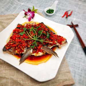 锅加蒸架开火水烧开后把鱼头放入.大火蒸三分钟,取出来将碗里蒸出来的血水倒掉,去掉垫在底下的筷子,将拌好的辣酱料均匀的铺在鱼头上,入锅大火蒸6分钟