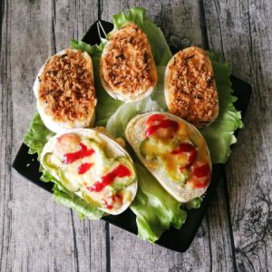 另外的馒头片是用平底锅处理的,一面刷橄榄油,油面向下小火煎制,朝上的一面涂抹千岛酱或沙拉酱,再撒上肉松,底面煎脆即可出锅。