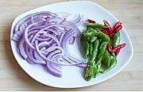 青红椒切段、洋葱分别切丝,姜切丝,葱切末