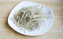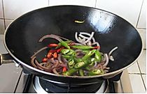 下洋葱丝、青红椒丝煸软,再将小银鱼倒入,翻炒均匀,调入少许盐(豆豉有咸味,盐一定要少加),沿锅边略加入少许水