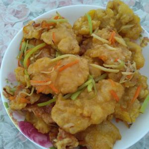 打一个鸡蛋,加粉面子,加适量水搅均成糊状备用。把葱,姜,胡罗卜切丝。用糖,醋加少许水调成汁备用。