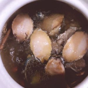 2-在锅里加入排骨,加入足量纯净水,花旗参,鲍鱼壳盖盖子,大火煮沸,转文火煮半个钟,加入鲍鱼,煮二十分钟
