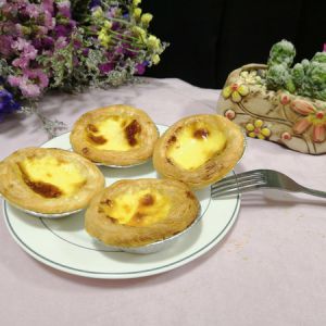 倒入蛋挞水至蛋挞皮中,七分满即可。