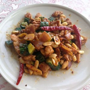 锅中放油,放入葱姜蒜干辣椒胡椒煸香,放入郫县豆瓣酱或者辣椒油,翻炒,倒入黄瓜鸡胸肉花生,大火翻炒