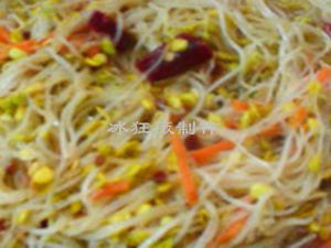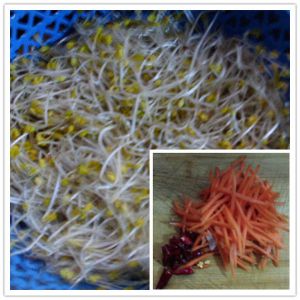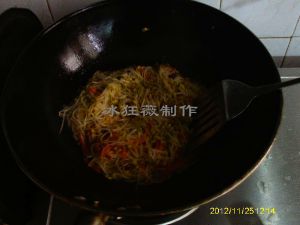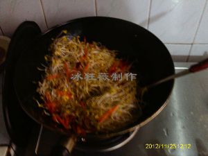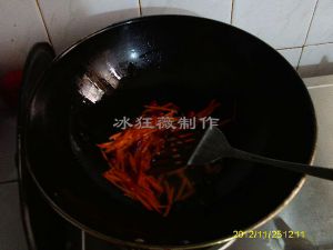 起油锅,胡萝卜丝、辣椒碎入锅翻炒。