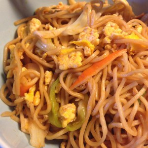 面条捞出来,锅里面擦干烧油(炒面是很油的大家都知道吧。。。磕入鸡蛋划散(如果火够大的话可以不用另拿一只碗搅鸡蛋又可以少洗一只碗)然后放蟹柳丝(纵切)用筷子翻搅,最后放青菜(手撕青菜保留纤维而且不用洗砧板才是重点好吗)继续用筷子翻搅大家都变软了之后就可以把刚才的八分熟面条丢进去了。