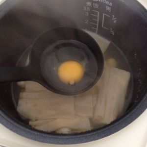 临出锅前加入鸡蛋。喜欢吃溏心蛋的就晚点加,鸡蛋煮3分钟即可