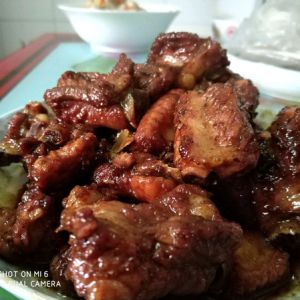 锅里加少量油,加冰糖小火融化,炒糖至咖啡色,倒入排骨大火迅速翻炒均匀,倒入剩余醋,加鸡精翻炒半分钟即可出锅
