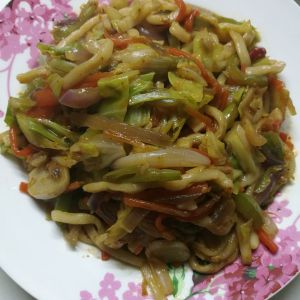 菜炒差不多加入面条,搅拌、翻炒入味。可以根据个人口味加入油泼辣子等调味。