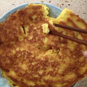 放油,等油热了放入蛋糊。我这里开始没掌握好全煎了,结果太厚了,两面有点焦了,所以建议一次少放点,做得薄些。然后很快,筷子夹一下,观察是否熟了。出锅,是不是很方便