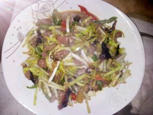 牛肉微微变色后将韭黄放入,然后放入青椒,再加入生抽,香醋,翻炒,而后放入鸡精和盐,翻炒出锅。