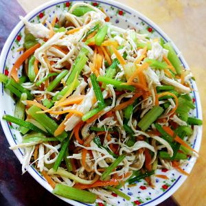 加入少量油,油热放入姜丝。依次放入芹菜,胡萝卜,鸡丝炒。(等芹菜和胡萝卜炒熟时放入鸡丝)再翻炒一会即可出锅,摆盘即可!