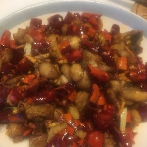 鸡腿肉1个,干辣椒1碗,花椒一把,姜蒜,大葱1根