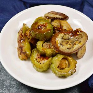 先将茄子两面煎之金黄捞出,再放入苦瓜和辣椒
