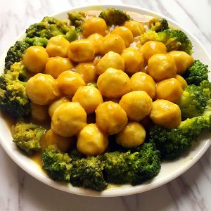 锅里倒入橄榄油,再放入煮好的鱼丸,加水没过鱼丸,放入烫好的西兰花,