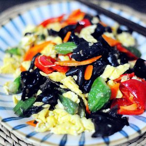 放入木耳、红辣椒和鸡蛋翻炒,出锅前放入少许盐调味即可