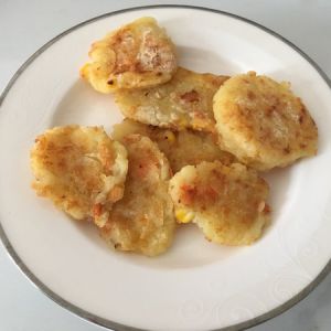 将土豆煮熟压成土豆泥,放入面粉、玉米粒、胡萝卜丁,少许盐少许水搅拌成较干的糊状