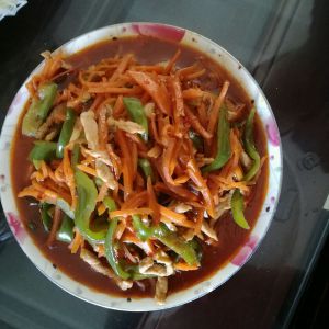 重新起锅,放入葱花蒜末,放入一汤勺蒜蓉辣酱一汤勺郫县豆瓣,炒香,放入胡萝卜丝和青椒丝。炒一会儿放肉丝,再放入一汤勺生抽,两汤勺醋两汤勺白糖,加入水适量。最后放入调好的水淀粉和适量的盐,收汁,出锅,开动。