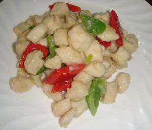 锅中放入底油,将葱姜煸炒出香味,放入青红椒翻炒,加入滑好的鸡肉,加入盐,味精,料酒调味,最后淋入水淀粉勾芡。