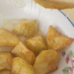 炸地瓜的油倒出,直接放入水半碗.糖少半碗.小火慢慢煎熬.出泡泡、筷子蘸蘸粘稠后.地瓜倒入锅中翻滚一下.出锅.
