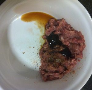 牛肉切成馅儿,(我直接买了冻牛肉丸),用盐,糖,鸡精,花椒粉,生抽腌制6~8分钟