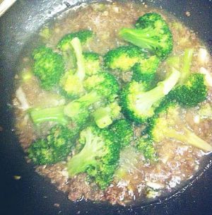 锅入油,爆葱花,加入腌好的牛肉馅炒匀入西兰花一起翻炒,把调好的汁倒入锅中,盖上盖子焖2分钟