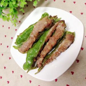 煎到肉表面变焦后,翻面,到尖椒皮变软即可