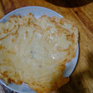 电饼铛加少许油,倒入面糊,然后将上面多的萝卜丝刮到旁边,这样萝卜丝饼就薄了
